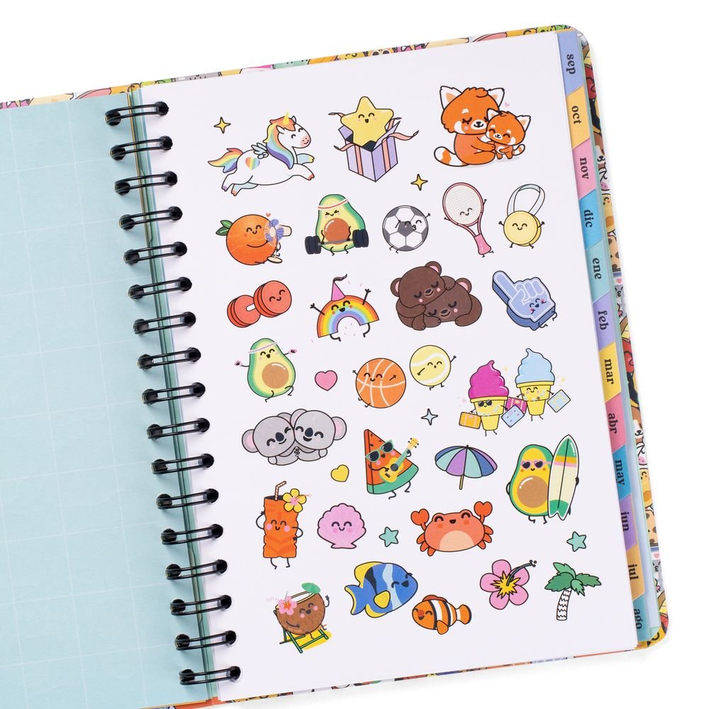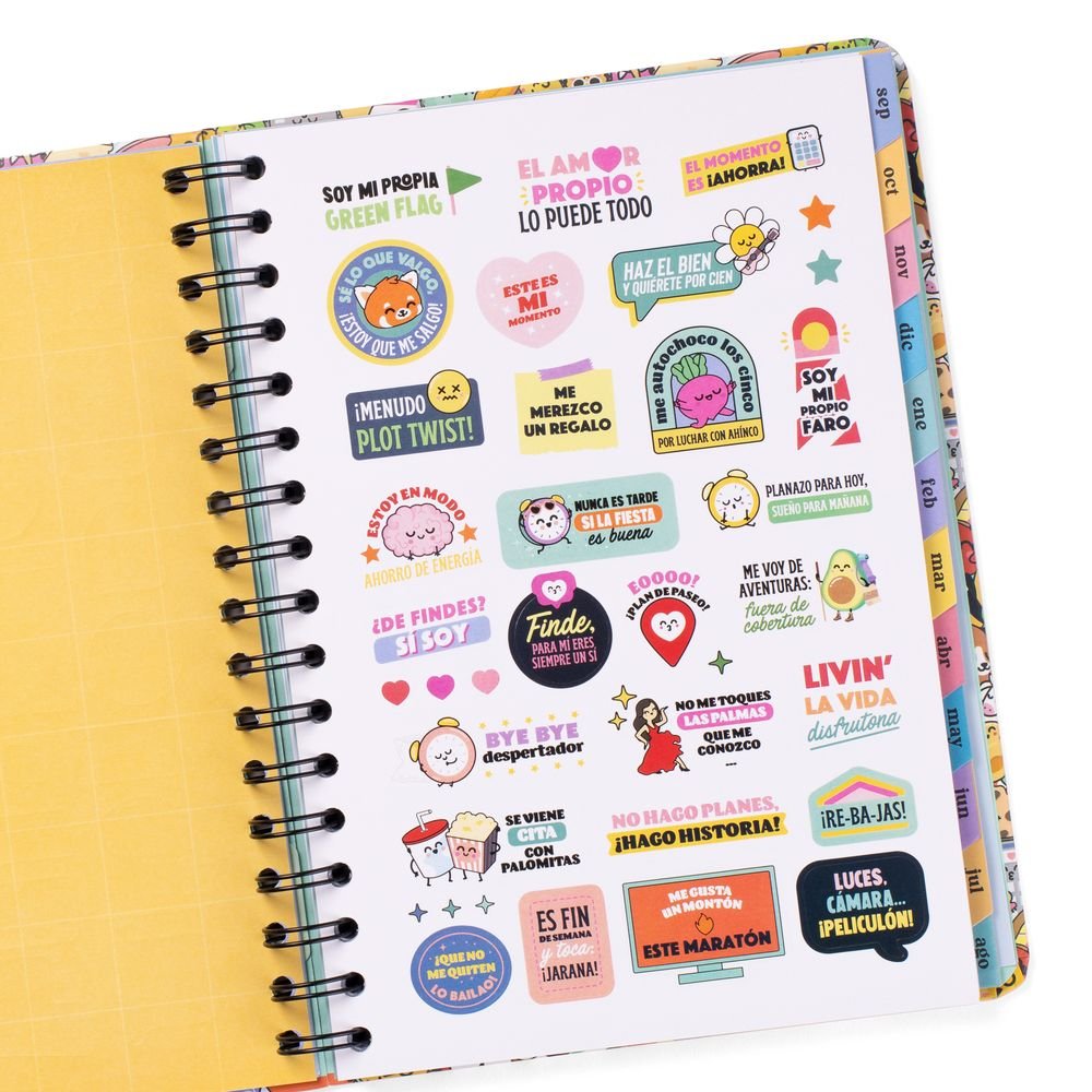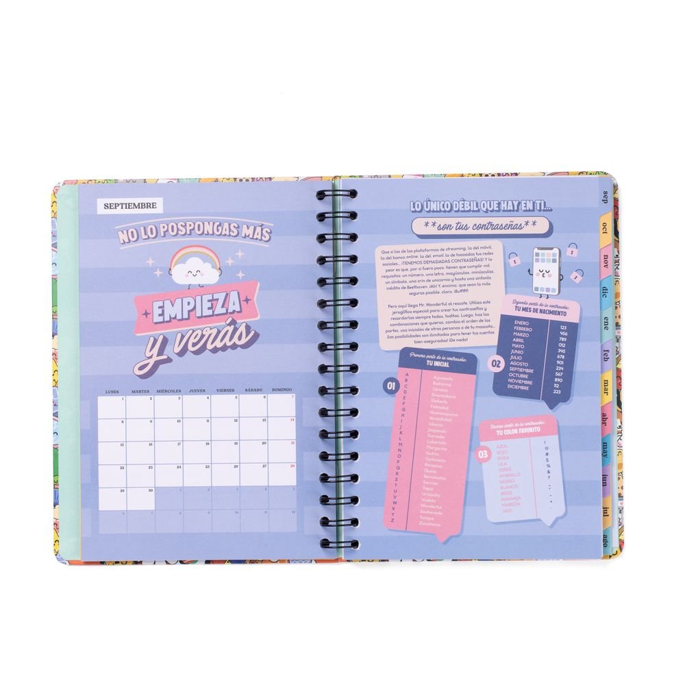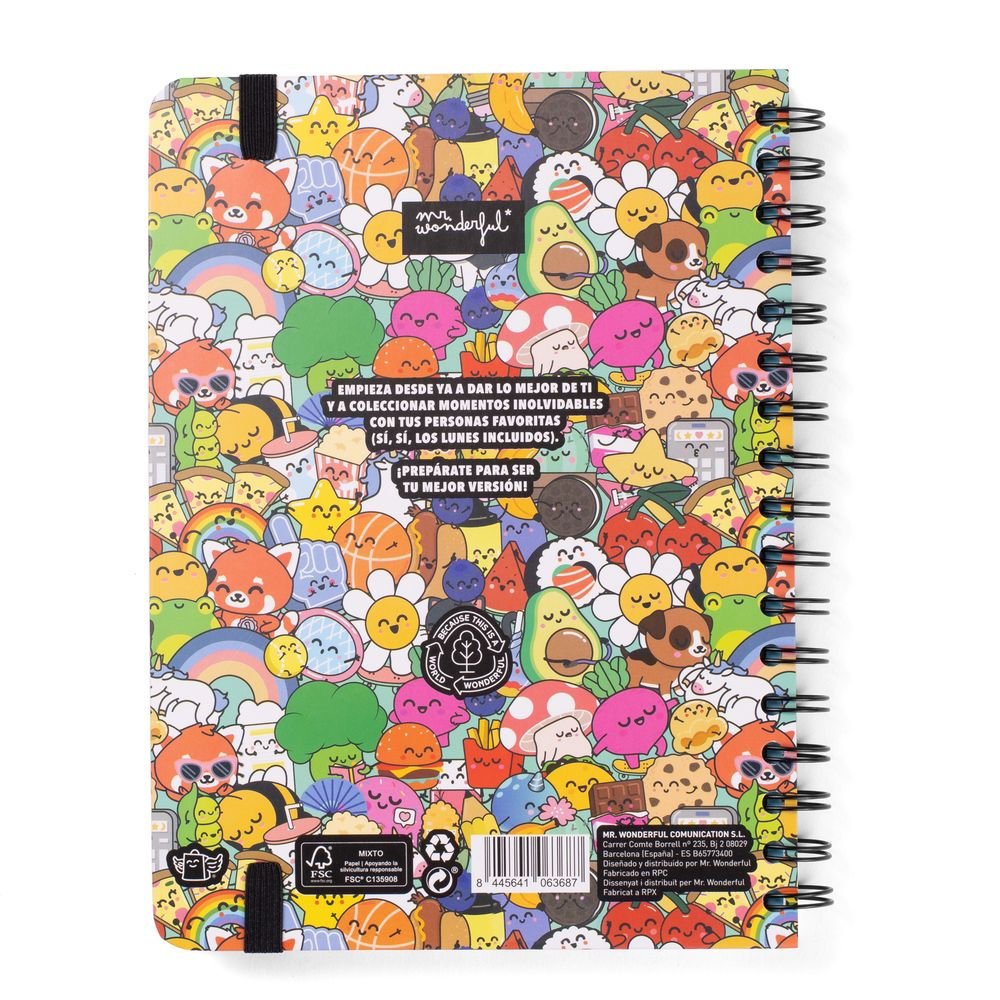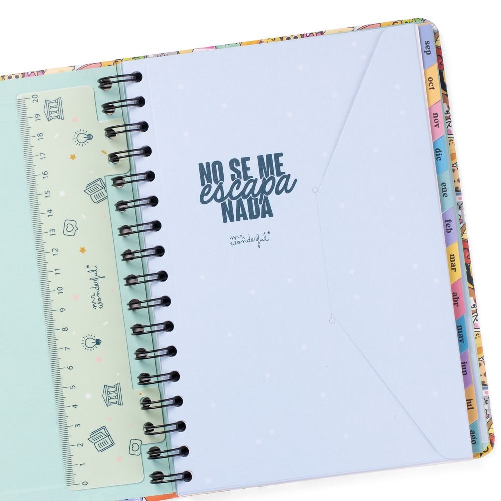 Características del producto: Agenda estilo Wonder de Mr. Wonderful, con organización semanal, va de septiembre de 2025 a finales de agosto de 2026. Esta agenda tiene como protagonistas a nuestros personajes Bo-Bo, que se pueden coleccionar en forma de bolígrafo borrable, y contiene: 160 páginas de papel de 100 gr con la certificación FSC // Frases diarias motivacionales // Separadores con pestaña para cada mes // Bolsillo interior de cartón // Regla de plástico interior // 8 hojas de pegatinas temáticas Bo-Bo // Horarios y calendarios (del último trimestre de 2025 y de 2026 y 2027 completos) // Playlist exclusiva // Páginas para anotar contactos // Tablas de ahorro // Cierre con goma elástica // Blocs de notas adhesivas con formas // Planificador mensual al inicio de cada mes // Frases mensuales superdivertidas