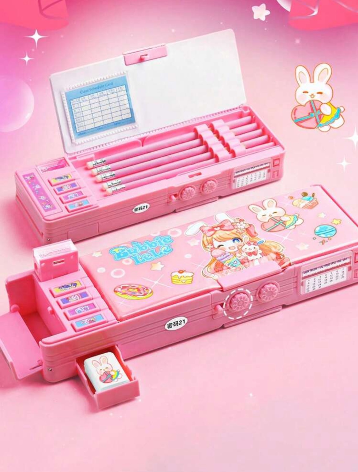 Es una caja con botones, que al apretarlos se abren compartimentos «secretos». La tapadera principal se abre con una contraseña que hay en la parte delantera que podrás quitar cuando te acuerdes de ella o guardes a buen recaudo. Dentro podrás colocar 6 lápices que para cogerlos tendrás que presionar un botón a la vez que tiras de ellos hacia arriba. Tiene también sacapuntas con depósito, y dos pequeños compartimentos para guardar la goma, clips o lo que necesites. También se puede abrir la parte de abajo y colocar de forma libre bolígrafos o rotuladores. Cuenta con calendario que podrás ir cambiando con una ruedecita y horario.
